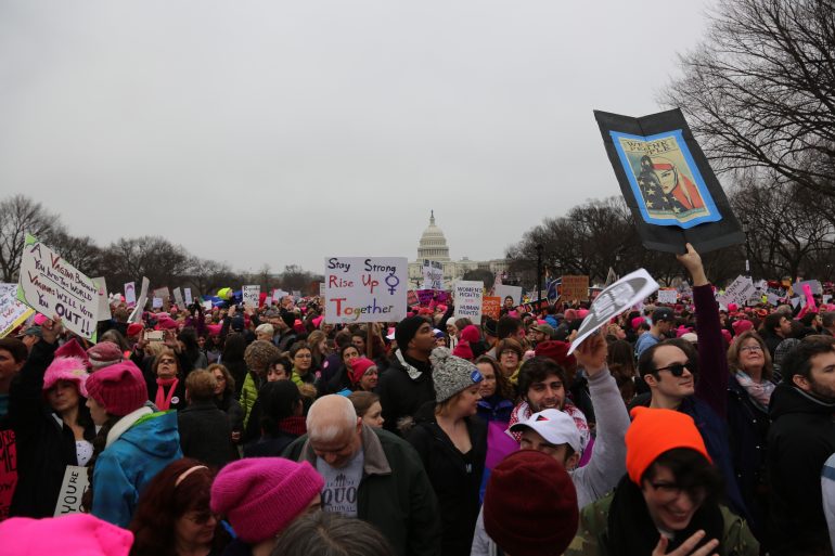 The number of people protesting overflowed the initial rally area, where speakers such as feminist icon Gloria Steinem and actress America Ferrera addressed the crowd. Instead, pinked-hatted women overtook the streets surrounding the National Mall, many chanting Clinton’s famous line that “women’s rights are human rights.”