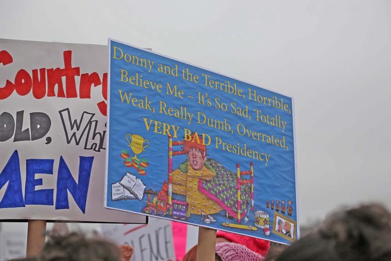 Other signs took a more negative approach, vilifying Trump in particular with condemning phrases and images. Several made references to Trump’s alleged ties to Russia, depicting the new president getting cozy with Russian President Vladimir Putin.