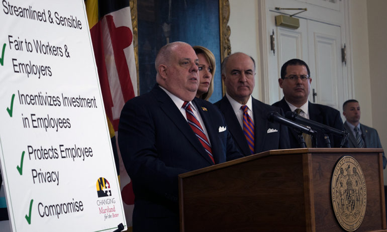 The emergency legislation, which Hogan said will be introduced Jan. 10, offers a middle ground between the governor’s previous bill, which was torpedoed in the Maryland Senate, and the “Healthy Working Families Act,” proposed and passed last session by Democrats and vetoed by the Republican governor.