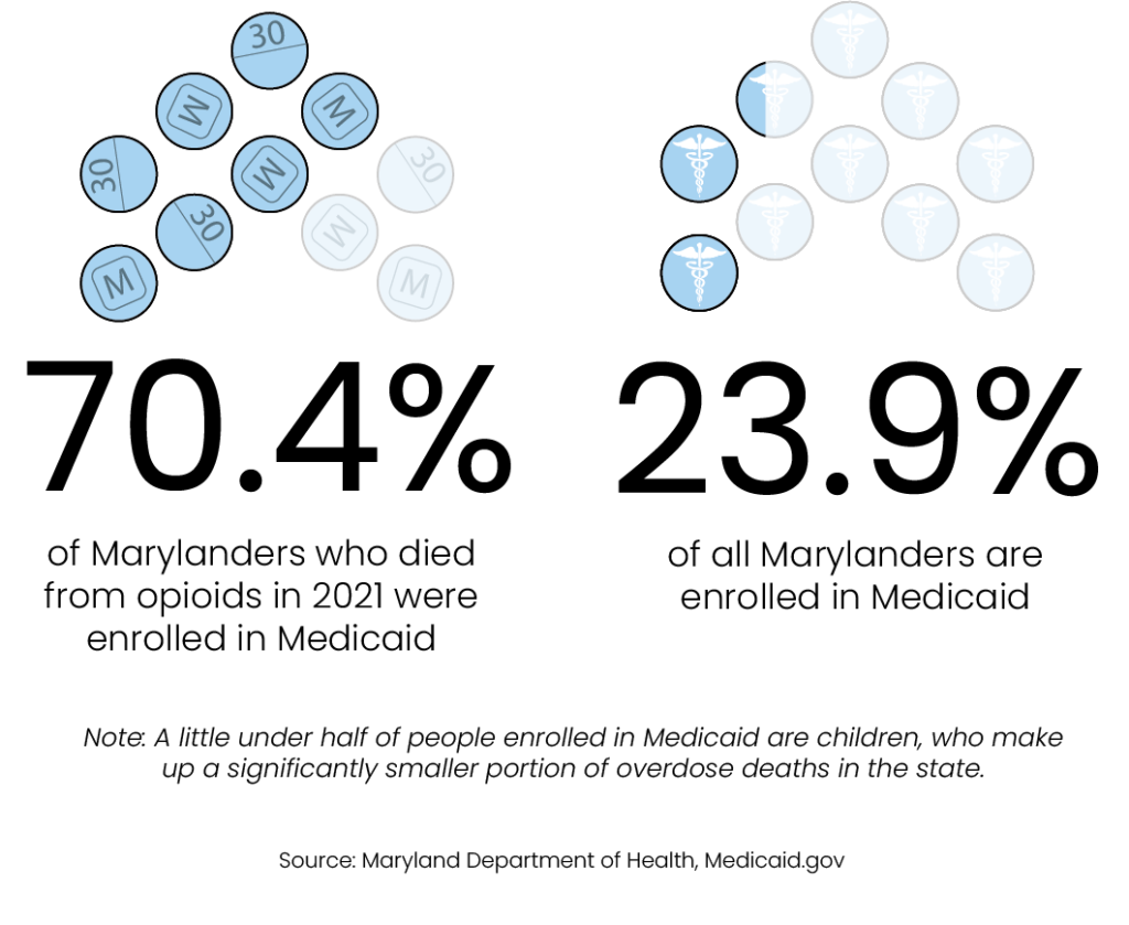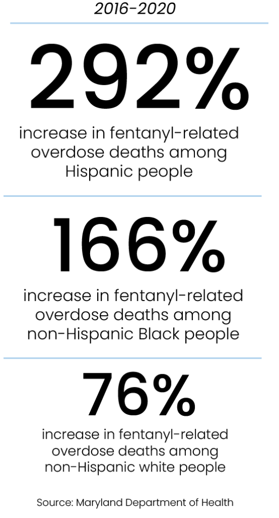 Black and Hispanic Marylanders account for a disproportionate rate of overdose deaths. In 2020, Black people accounted for 40 percent of all fentanyl-related deaths in the state, yet only 31 percent of Maryland’s population is Black.