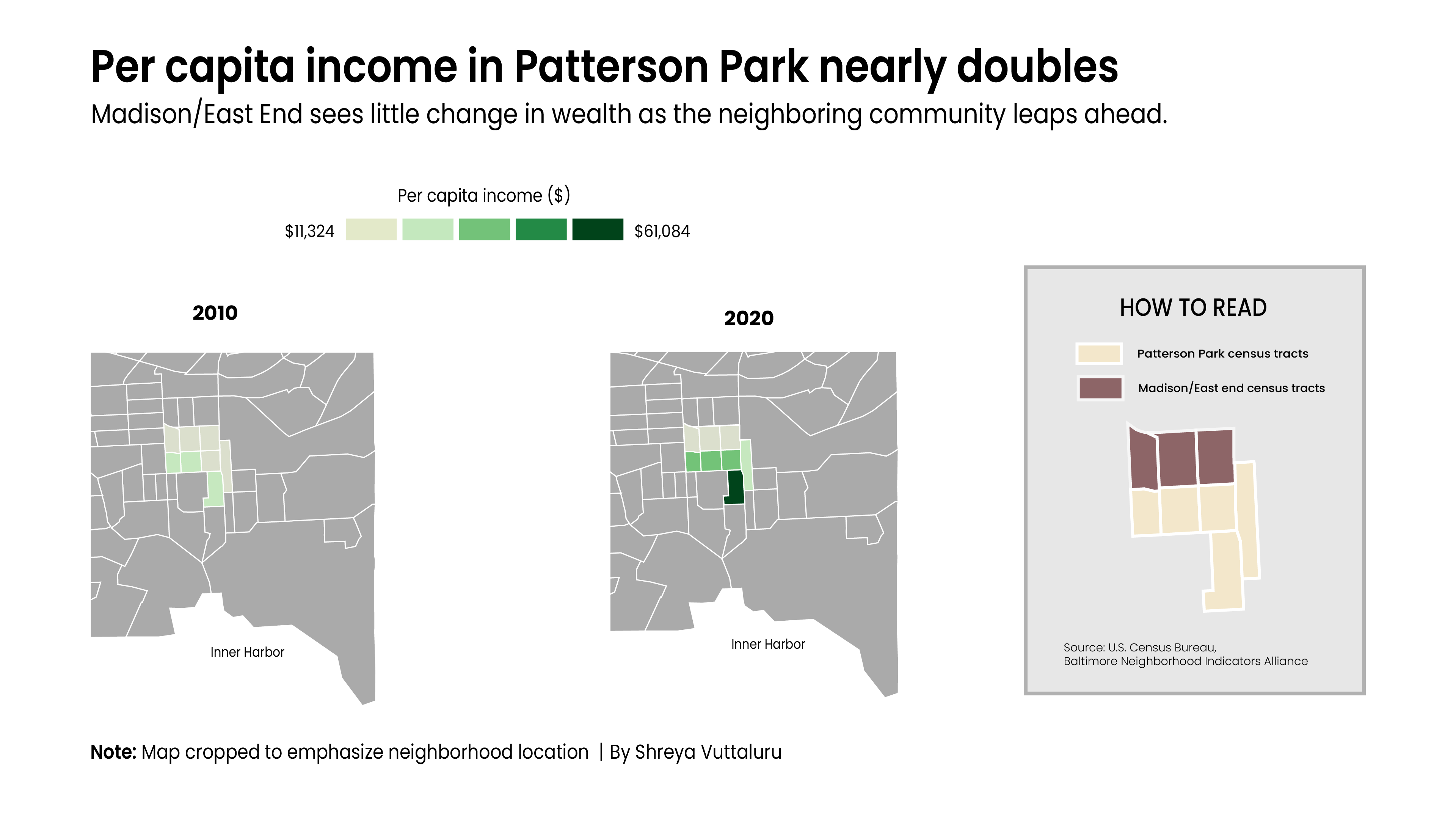 The per-capita income for the McElderry Park area in 2020 was $13,736, well below the federal poverty line, according to a Capital News Service analysis of census data. Patterson Park, however, saw its per-capita income rise to $39,107 in 2020, a $14,882 increase since 2010.