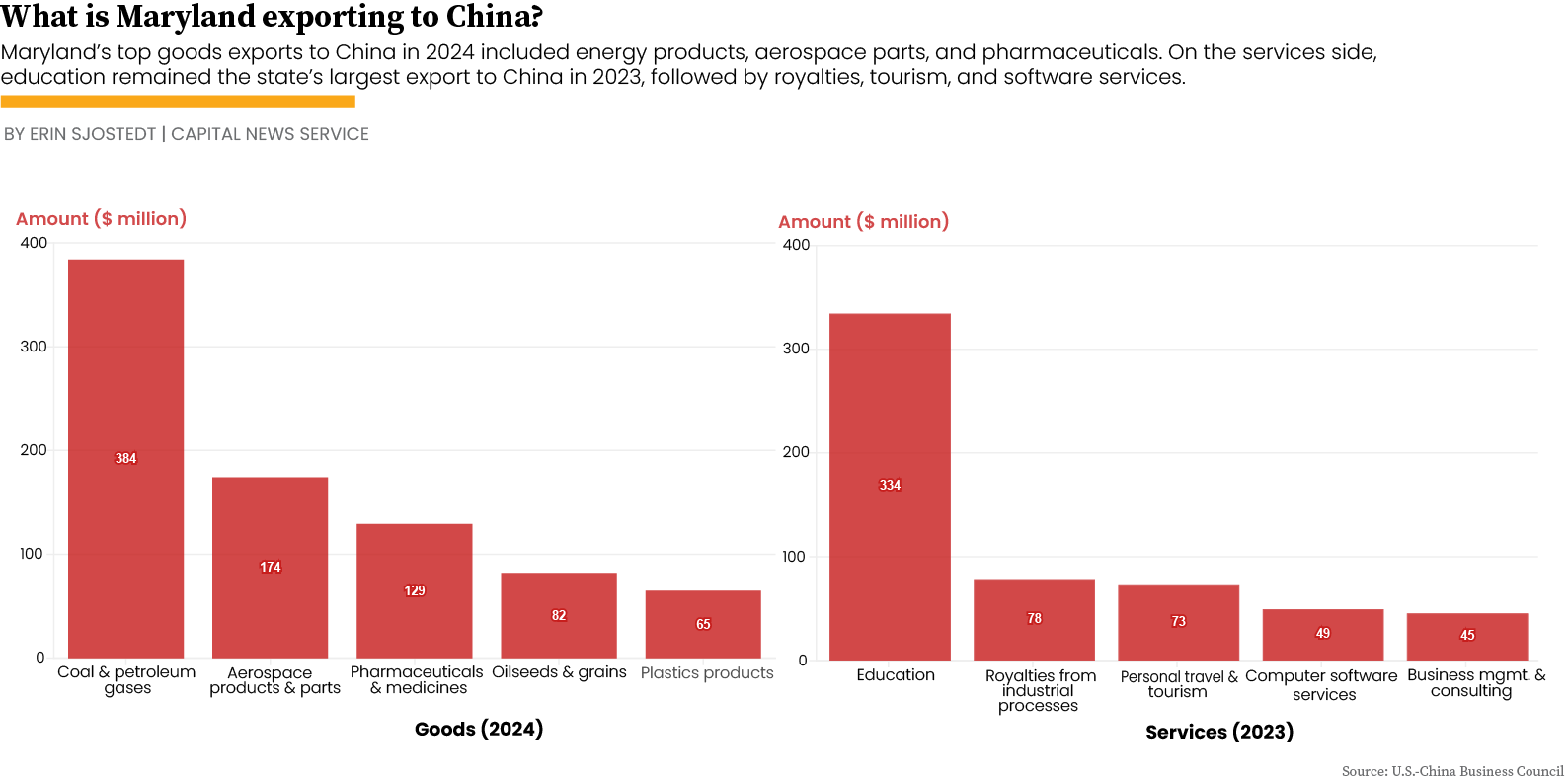 Services, which are not usually subject to tariffs, also showed gains in the recent USCBC report. Maryland’s service exports to China increased 10 percent from 2022 to 2023. Education, Maryland’s top service export to China at $334 million in 2023, depends heavily on international student enrollment.
