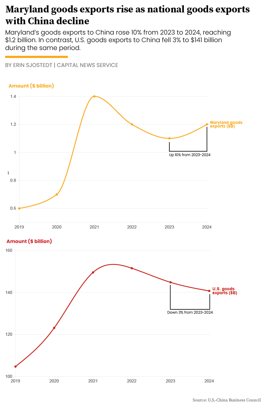 Maryland’s goods exports to China increased from approximately $1.1 billion to $1.2 billion over the same period, according to the USCBC. China represented 7 percent of Maryland’s foreign goods exports and 5 percent of its foreign services exports in 2024. Though Maryland trails larger export powerhouses like Texas and California, China’s share of the state’s trade portfolio has grown.
