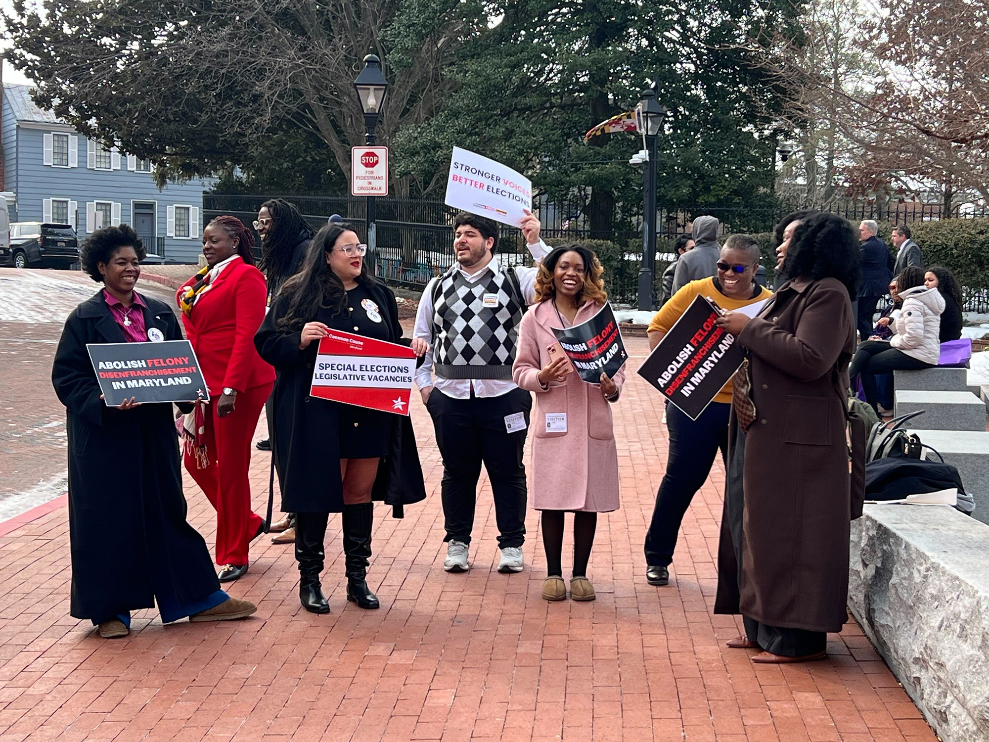 Outside the Maryland Statehouse, Neka Duckett-Randolph of Baltimore stood with a small group and held up a sign that read, “Abolish Felony Disenfranchisement in Maryland.”